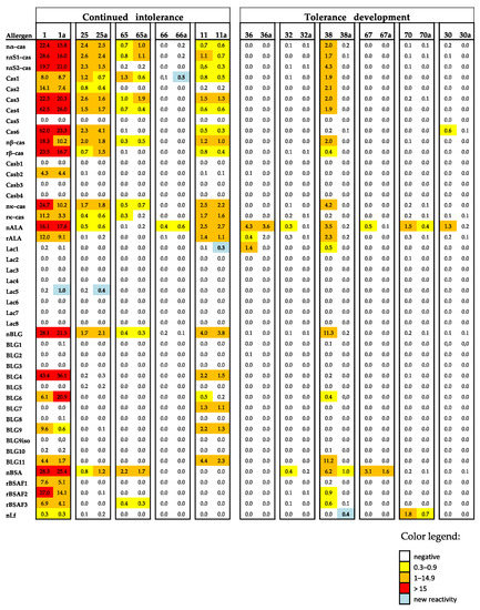Heat map of the IgE levels specific for caseins and casein-derived peptides and other milk allergen proteins and peptides thereof in the sera of patients with continued intolerance and those developing tolerance before and after elimination (a). The IgE (ISU-E) levels are shown with a color code.