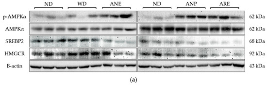 The antibodies were anti-phosphorylated-AMPKα (p-AMPKα), anti-AMPKα, anti-SREPB2, anti-HMGCR, anti-β-actin, and anti-rabbit and were purchased from Cell Signaling Technology (Boston, MA, USA). Liver tissue preparation and Western blot analysis were performed according to our previous method [32]. Briefly, liver tissue was homogenized in a homogenizer (Speedmill plus, Analytik Jena, Germany) with modified RIPA buffer (50 mM Tris-HCl (pH8.0), 150 mM NaCl, 1 mM EDTA, 1% Nonidet P-40, 0.25% Na-deoxycholate, 1 mM sodium fluoride, 1 mM sodium orthovanadate, 1 mM phenylmethylsulphonyl fluoride), plus a proteinase inhibitor cocktail (Nacalai Tesque, Inc., Kyoto, Japan). The supernatants were collected after centrifuging for 15 min at 14,000 rpm and 4 °C. The protein content of the lysates was measured with a protein assay kit (Bio-Rad Hercules, CA, USA) as instructed. Proteins were separated onto 10% sodium dodecyl sulfate polyacrylamide gels and then transferred to polyvinylidene difluoride membranes and blocked with 5% skim milk powder in phosphate-buffered saline with Tween-20. The mentioned primary monoclonal antibody was incubated overnight at 4 °C, followed by a secondary antibody diluted 2000 times in skimmed milk for an hour at room temperature. Blots were visualized using a Bio-Rad LumiVision PRO system with an enhanced chemiluminescence kit (Taitec, Saitama, Japan).