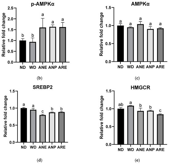 According to the serum results, the ANP reduced WD-induced T-Cho levels. Therefore, we detected and quantified the key factors involved in cholesterol synthesis by Western blotting. Due to large number of samples, we performed Western blotting in two plates using the same ND as the control (Figure 5a). The blot density was then quantified and normalized with ND. As shown in Figure 5b, WD did not activate p-AMPKα while ANE, ANP and ARE activated p-AMPKα (Figure 5b). The total AMPKα had no significant change in all groups (Figure 5c). The expression levels of SREBP2 and HMGCR were significantly decreased by the ANE, ANP, and ARE (Figure 5d,e). These results revealed that the areca nut and its ingredients might inhibit WD-induced cholesterol synthesis.