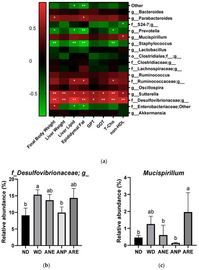 Finally, we used Pearson correlation analysis to explore the relationship between the gut microbiome community and serum biochemical profiles. As shown in Figure 7a, significant negative correlations were observed in final body weight, liver lipid, epididymal fat T-Cho, and the relative abundance of g_Prevotella and g_Staphylococcus. On the other hand, significantly positive correlations were observed in final body weight, liver weight and fat, epididymal fat, GPT, GOT, T-Cho, and non-HDL, and the relative abundance of g_Sutterella, and f_Desulfovibrionaceae;g. ANP decreased the abundances of these two bacteria with significance. It is noteworthy that f_Desulfovibrionaceae;g was correlated with NAFLD [36].