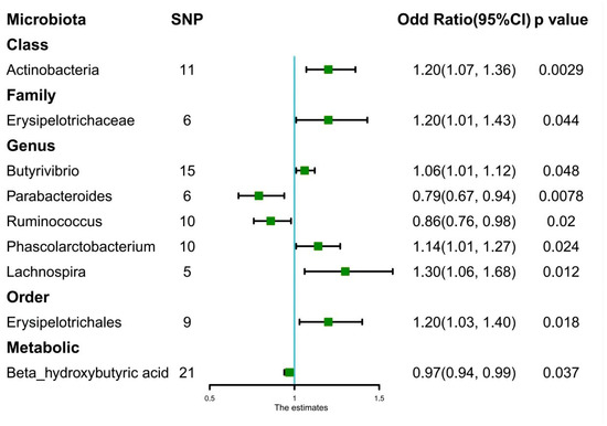 Only Class Actinobacteria (OR: 1.20, 95% CI: 1.07–1.36, p = 0.0029) satisfied the Bonferroni-corrected test after analyzing the genetic association between 211 microbiota and IgAN (Figure 1). No metabolites achieved significant causal effects on IgAN (p > 3.3 × 10−3). Table 1 displays the causal relationship between intestinal flora and various outcomes. The reverse causal analysis (Supplementary Table S4) did not show a significant causal effect of IgAN on microbiota or metabolites (p > 0.05).