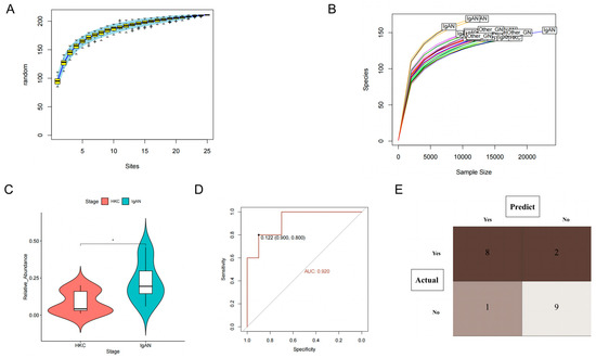 Clinical validation of Actinobacteria in the identification of immunoglobulin A nephropathy. (A) Species accumulation curve for clinical samples; (B) Dilution curves of sequencing depth and species richness; (C) Differences in Actinobacteria abundance between IgAN and healthy controls; (D) The receiver operating characteristic (ROC) of Actinobacteria (compare with healthy control); (E) The confusion matrix of Actinobacteria discriminating abilities (compare with healthy control).