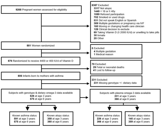 Study Participants and Setting: Detailed methods are provided in the Supplementary Materials. Analyses were performed using data from the VDAART clinical trial (https://clinicaltrials.gov/ct2/show/NCT00920621, accessed on 4 May 2023) and replication of the findings was sought in data from the COPSAC clinical trial. VDAART [14] is a double-blind placebo-controlled multi-site study on the effects of prenatal vitamin D supplementation on asthma and allergy in offspring. The study protocol was approved by the institutional review boards at each participating institution and at Brigham and Women’s Hospital. COPSAC [6] is a Danish birth cohort study on the development of asthma and allergies. The COPSAC2010 study was approved by the local ethics committee with a separate approval for the vitamin D administration during pregnancy RCT, by the Danish Data Protection Agency, and by the Danish Health and Medicines Authority. All participants provided written informed consent.
