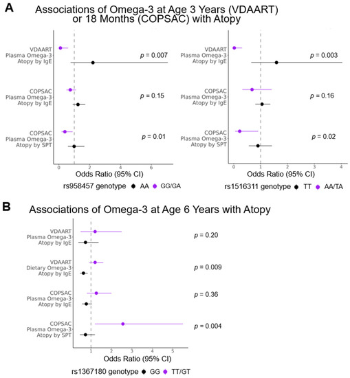 Associations of n-3 and atopy in VDAART and COPSAC participants stratified by rs958457 and rs1516311 genotypes (A) and rs1367180 genotype (B). Odds ratios, 95% confidence intervals and p values for interaction tests from covariate-adjusted logistic regression analyses under an additive genetic model are provided. Abbreviations: SPT = skin prick test.