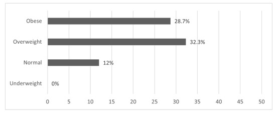 Assessment of the study participants’ knowledge about the recommended weight gain during pregnancy showed that the total percentage of participants who correctly selected the weight gain suitable for their pre-pregnancy weight category was 26.8% (n = 141). A chi-square analysis was conducted to investigate the association between the pre-pregnancy weight category and knowledge about recommended weight gain during pregnancy. The percentage of pregnant women who correctly chose the suitable weight gain during pregnancy was 0.0% in underweight participants, 12.0% in normal weight participants, 32.3% in overweight participants, and 28.7% in obese participants (χ2 (6) = 21.346; p = 0.002) (Figure 1). Furthermore, an independent samples Kruskal–Wallis test showed significant differences in correctly selecting the recommended weight gain during pregnancy between the different BMI classifications (χ2 (3) = 14.758; p = 0.002), with a mean rank score in correctly choosing weight gain during pregnancy of 277.88 for the overweight, 268.61 for the obese, 224.45 for the normal weight, and 193.00 for the underweight. Overweight participants were significantly different from normal weight (p < 0.001) participants. Obese participants were significantly different from normal weight participants (p = 0.002). No significant differences were detected between overweight and obese, overweight and underweight, obese and underweight, or normal and underweight.