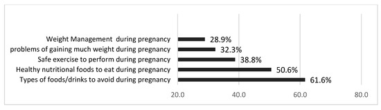 When asked about eating habits, except for healthy nutritional foods (50.6%) and foods and drinks to avoid during pregnancy (61.6%), a minority of participants indicated that they received information about weight management, safe exercises and amount of exercise, and nutritional foods to eat during pregnancy (Figure 2).