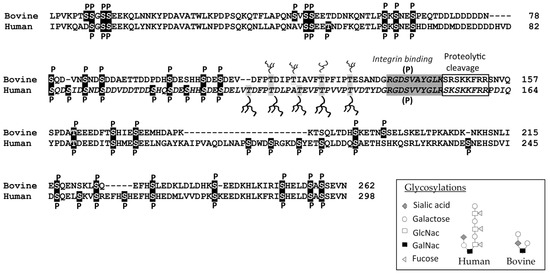 Alignment of bovine and human milk osteopontin (OPN). Phosphorylation and glycosylation sites identified in milk OPN are highlighted in black and grey, respectively [61,62]. The potential phosphorylation (P) of the SVAYGLK/SVVYGLR motif is also indicated [55]. The integrin-binding motifs are indicated in dark grey, and the regions containing the identified cleavage sites of OPN in milk are boxed [63,64]. The different glycan structures of OPN in bovine and human milk are indicated in the inserted box [13,65,66].