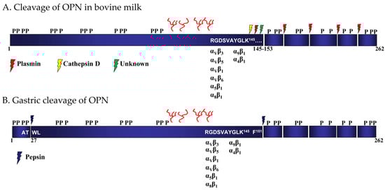 In human and bovine milk, OPN is present as both a full-length protein and as different N-terminal-derived fragments resulting from endogenous proteolytic activity in the milk [10,57,63,64]. A conserved region of the OPN sequence next to the RGD and SVVYGLR (SVAYGLK in bovine OPN) motifs is particularly susceptible to proteolytic cleavage, as it contains many sites for proteases (plasmin, thrombin and cathepsin D) [63,64] (Figure 1 and Figure 2).