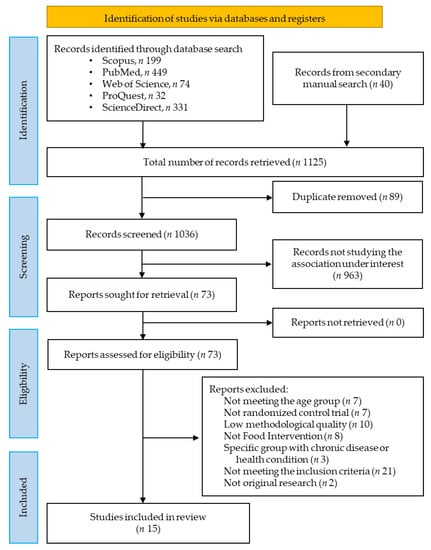A total of one thousand one hundred and twenty-five records were retrieved after an extensive literature search from the databases, among them 199 from Scopus, 449 from PubMed, 74 from Web of Science, 32 from ProQuest, 331 from ScienceDirect, and 40 records from a secondary manual search. After the removal of 89 records as duplicates, 1036 records were retained for primary screening by examining titles and abstracts. A further 963 records were eliminated and the remaining 73 studies met the criteria for full-text evaluation. Then, a total of 58 records were excluded according to the established inclusion and exclusion criteria for this study.