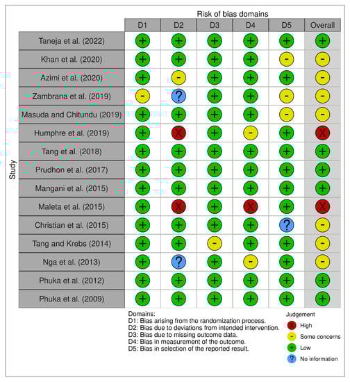 The quality of included studies analyzed for randomized trials and eligibility for meta-analysis. The overall quality rating (QR) of all selected studies is represented in Table 2. In 46.7% of studies, the study participants and providers were unblinded to treatment group assignment. Among selected studies, two studies did not represent the baseline data [18,26]. Two studies did not represent the output (stunting/linear growth) as LAZ score [15,17]. In addition, some studies were not included in the meta-analysis due to the fact that the data were in a different format.