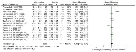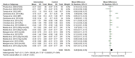 The primary outcome of the meta-analysis is the effect of the food-based intervention on stunting or length-for-age z-score (LAZ), which was assessed based on several RCTs. The forest plot of the LAZ score is shown in Figure 4. Pooled analysis revealed that food-based intervention led to an improvement in linear growth (MD: 0.20, 95% CI: 0.04 to 0.35, p = 0.01). The effect was assessed in 12,170 participants (6624 participants from the intervention group and 5546 participants from the control group). The heterogeneity between studies was high, and there was a significant between-study heterogeneity (I2 = 94%; p < 0.00001). The difference in heterogeneity might relate to the population differences in various studies.