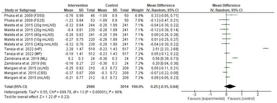 The forest plot of the effect of the food-based intervention on the underweight or weight-for-age z-score (WAZ) is shown in Figure 5. The analysis of effect size was assessed in 6000 participants (2986 from the intervention group and 3014 from the control group). Pooled analysis from the random-effects model indicated that there was no significant difference in change of underweight status between the intervention and control groups (MD: 0.25; CI: −0.15 to 0.64; p = 0.22). The heterogeneity between studies was also high (I2 = 98%), and there was a significant between-study heterogeneity (p < 0.00001).
