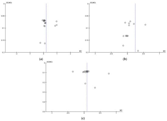 Publication bias represented as funnel plots: (a) Stunting; (b) Underweight; (c) Wasting.