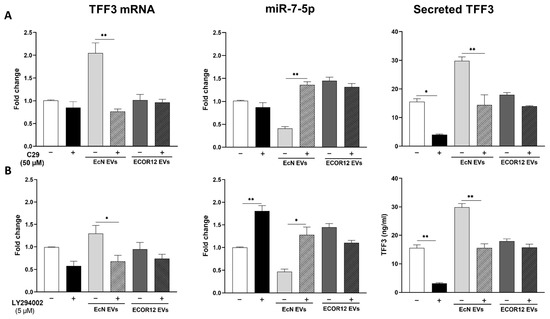 In the non-stimulated control cells, the inhibition of the PI3K pathway with the LY294002 treatment significantly increased the miR7-5p expression levels (p ≤ 0.01). Consequently, the expression levels of the target TFF3 mRNA were diminished by this treatment (Figure 2B). The same expression pattern, the upregulation of miR7-5p (p ≤ 0.05) and the downregulation of TFF3 (p ≤ 0.05), was observed in LS174T cells stimulated with EcN EVs in the presence of LY294002 (Figure 2B). In the cells challenged with ECOR12 EVs, the results indicate that, after the LY294002 treatment, there were no statistically significant changes affecting the TFF3 or miR-7-5p expressions (Figure 2B).