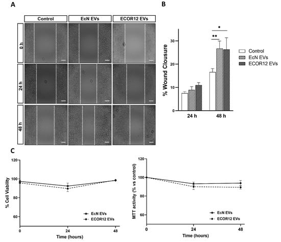 Figure 3. EVs from EcN and ECOR12 activate goblet cell restitution. Wounds were generated in LS174T cells using the culture inset system. After removing the insets, cells were incubated in FBS-free RPMI medium in the presence of EVs (10 µg/mL) from EcN or ECOR12 or without any stimuli. (A) Representative images of scratched areas at 0, 24, and 48 h are shown (Scale bar = 100 µm). (B) Analysis of wound closure. ImageJ was used to measure the width along the cell-free gap. Results are presented as the percentage of wound closure at 24 h and 48 h compared to the wound at time 0 h and expressed as mean ± SEM. (C) Cell viability under the experimental conditions assessed with the MTT and trypan blue exclusion assays. In all panels, data are expressed as mean ± SEM from three independent experiments. Differences were evaluated with one-way ANOVA, followed by post hoc Tukey’s. * p ≤ 0.05, ** p ≤ 0.01 vs. control group.