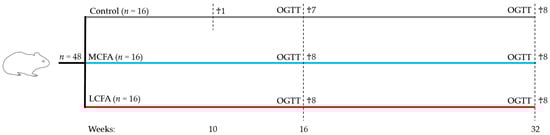 Study design. Forty-eight guinea pigs were block-randomized based on weight into three different diet groups: a low-fat control diet (control), a MCFA-rich high-fat diet (MCFA), and a LCFA-rich high-fat diet (LCFA). They had one week of acclimatization. One guinea pig in the control group was not included as it was euthanized during week 10 due to exceeding the humane endpoint of 20% lower bodyweight than the group mean. Seven animals from the control group and eight animals from the MCFA and LCFA groups were euthanized (♰) after 16 weeks. These animals underwent an oral glucose tolerance test (OGTT) prior to euthanization. The remaining animals continued on the diet for 32 weeks and underwent OGTT before euthanization.