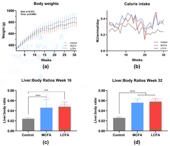 Body weights, feed intake, and liver:body ratios. (a) Body weights across the experimental period; the log-transformed data were analyzed using a mixed-effects model with repeated measures. The overall effects of diet and time are shown on the graph. The data are presented as the means with the SD. (b) Calorie intake across the experimental period estimated pr. animal from the group feed intake. The MCFA and LCFA groups were fed ad libitum, while the control group was pair-fed to ~67% of the equivalent calories ingested by the MCFA group. The data were analyzed with a Mann–Whitney test and are presented as exact values. (c) The liver:body ratios at week 16 and (d) the liver:body ratios at week 32. The log-transformed liver:body ratios were analyzed by Welch’s test with Dunnett’s multiple comparisons test and are presented as medians with the inter-quartile range. *** p < 0.001 and **** p < 0.0001. The body weights for the control and MCFA groups have been published previously []. Control: low-fat control diet, MCFA: medium-chain fatty-acid-rich high-fat diet, and LCFA: long-chain fatty-acid-rich high-fat diet.