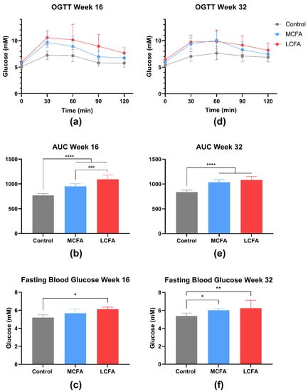 Oral glucose tolerance tests (OGTTs). The OGTT curves and the area under the curve (AUC) are presented as the means with the SD. The fasting blood glucose is presented as the medians with the inter-quartile range. (a) The OGTT curve at week 16. (b) The AUC at week 16; the data were analyzed by a one-way ANOVA with Tukey’s multiple comparisons test. (c) The fasting blood glucose at week 16; the data were analyzed by a Kruskal–Wallis test with Dunn’s multiple comparisons test. (d) The OGTT curve at week 32. (e) The AUC at week 32; the data were analyzed by a one-way ANOVA with Tukey’s multiple comparisons test. (f) The fasting blood glucose at week 32; the data were analyzed by a Kruskal–Wallis test with Dunn’s multiple comparisons test. * p < 0.05, ** p < 0.01, and **** p < 0.0001, compared to the control group. ### p < 0.001, compared to the MCFA group. The data (except the fasting blood glucose) for the control and MCFA groups have been published previously []. Control: low-fat control diet, MCFA: medium-chain fatty-acid-rich high-fat diet, and LCFA: long-chain fatty-acid-rich high-fat diet.