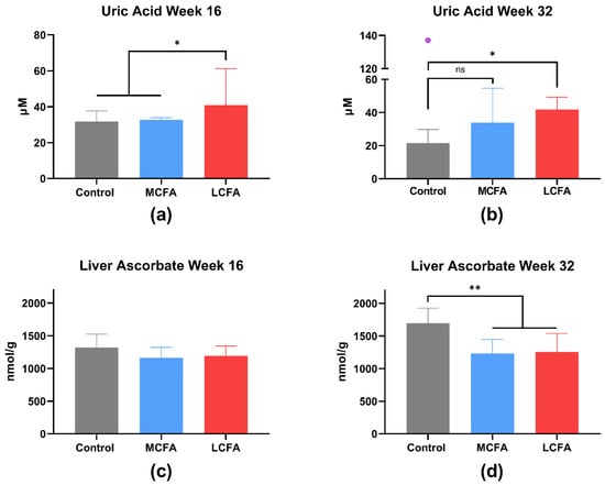 The concentration of uric acid in plasma was significantly higher in the LCFA group compared to the control group at both time points (week 16: p = 0.023; week 32: p = 0.018) and compared to the MCFA group at week 16 (p = 0.033) (Figure 5a,b). In one animal from the control group, the uric acid concentration was more than double the highest measured values in any other of the measured samples; hence, it was excluded from the statistical analysis. The ascorbate levels in plasma did not differ between the groups (Table 4).
