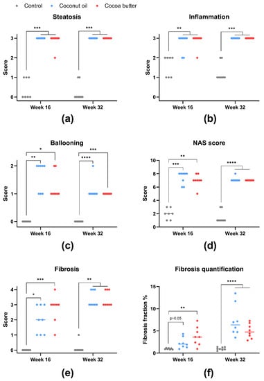 Histopathological scoring and fibrosis quantification. The data are presented as the individual scores with the medians. (a) The steatosis scores on a scale of 0–3, (b) the inflammation scores on a scale of 0–3, (c) the ballooning scores on a scale of 0–2, (d) the NAFLD activity score on a scale of 0–8, (e) the fibrosis scores on a scale of 0–3, and (f) fibrosis quantification in %. The histopathological scores and fibrosis fraction at week 16 were analyzed using the non-parametric Kruskal–Wallis test with a Dunn’s multiple comparisons test. The log-transformed fibrosis fraction at week 32 was analyzed by one-way ANOVA. * p < 0.05, ** p < 0.01, *** p < 0.001, and **** p < 0.0001. The data for the control and MCFA groups have been published previously []. Control: low-fat control diet, MCFA: medium-chain fatty-acid-rich high-fat diet, and LCFA: long-chain fatty-acid-rich high-fat diet.