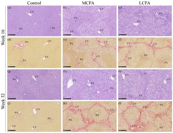 Representative histological images from each group at both time points. (a–c) Hematoxylin and eosin stain at week 16, (d–f) picrosirius red stain at week 16, (g–i) hematoxylin and eosin stain at week 32, (j–l) picrosirius red stain at week 32. (k,l) show livers with F4A scores (mild cirrhosis). The scale bar shows 250 µm. CV: central vein; PA: portal area. Control: low-fat control diet, MCFA: medium-chain fatty-acid-rich high-fat diet, and LCFA: long-chain fatty-acid-rich high-fat diet.