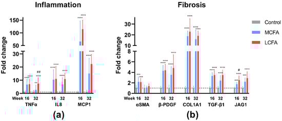 Expression of inflammatory and fibrotic genes. The data were analyzed by two-way ANOVA with Tukey’s multiple comparisons test and are presented as the means with ranges expressed as fold changes relative to the control. (a) Expression of inflammatory genes: TNFα, tumor necrosis factor α; IL8, interleukin 8; MCP1, monocyte chemotactic protein 1. (b) Expression of fibrotic genes: αSMA, α smooth muscle actin; β-PDGF, β-platelet-derived growth factor; Col1a1, collagen 1a1; TGF-β1, transforming growth factor β1; JAG1, jagged1. Different from the control group ** p < 0.01, different from the control group *** p < 0.001, different from the control group **** p < 0.0001. Different from the MCFA group # p < 0.05; different from the MCFA group ## p < 0.01. Control: low-fat control diet, MCFA: medium-chain fatty-acid-rich high-fat diet, and LCFA: long-chain fatty-acid-rich high-fat diet.