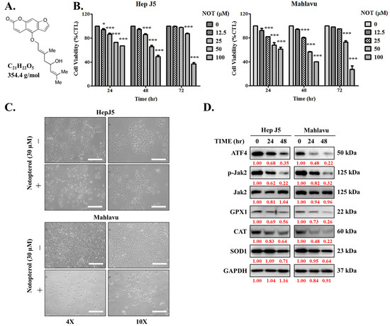 First, the impact of notopterol (NOT), which has a depicted chemical structure, molecular formula of C21H22O5, and molecular weight of 354.4 g/mol (Figure 1A), was evaluated on HCC using the HepJ5 and Mahlavu cell lines. The cell cytotoxicity assays of NOT-treated cells compared with untreated control cells revealed that HepJ5 cells exhibited significantly reduced cell viability in a dose- and time-dependent manner. Specifically, exposure to 100 μM NOT for 24 h, 48 h, and 72 h resulted in a 33% (p < 0.001), 49% (p < 0.001), and 64% (p < 0.001) reduction in viability, respectively (Figure 1B, left). Similarly, a 39% (p < 0.001), 60% (p < 0.001), and 79% (p < 0.001) reduction in Mahlavu cell viability was observed upon treatment with 100 μM NOT for 24 h, 48 h, and 72 h, respectively (Figure 1B, right). Upon 48 h treatment with 30 μM NOT, in addition to the significant reduction in cell numbers, a transformation of the HCC cells from elongated spindle-like to cuboid morphology was observed (Figure 1C). In parallel assays, treatment with 30 μM NOT was shown to markedly downregulate the expression levels of ATF4, p-JAK2, GPX1, CAT, and SOD1 proteins in the HepJ5 and Mahlavu cell lines in a time-dependent manner (Figure 1D). These results suggest that notopterol suppresses HCC cell viability by inhibiting JAK2 activation and enhancing oxidative stress through the modulation of the aforementioned markers.