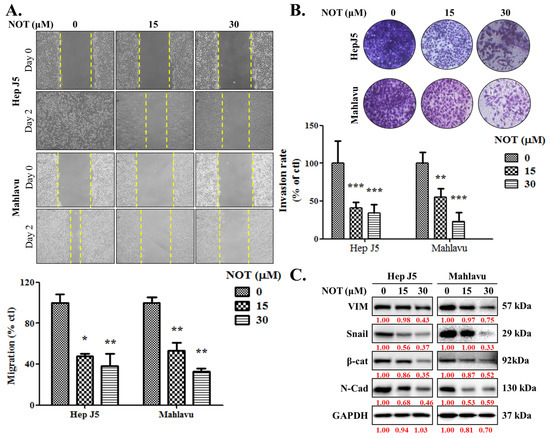 As enhanced cell migration and invasion are key components of cancer metastasis and progression [19], the effect of NOT on these aspects was investigated. When compared with the untreated control, HepJ5 cells treated with 15 and 30 μM NOT exhibited a 53% (p < 0.05) and 62% (p < 0.01) decrease in migration, respectively (Figure 2A). A 47% (p < 0.01) and 68% (p < 0.01) reduction in migration was observed in Mahlavu cells treated with 15 and 30 μM NOT, respectively (Figure 2A). Similarly, treatment with 15–30 μM NOT significantly inhibited the invasion of HepJ5 (56–79%, p < 0.001) and Mahlavu (52–81%, p < 0.001) cells compared to the untreated control cells (Figure 2B). Additionally, it was found that HepJ5 and Mahlavu cells treated with 15–30 μM NOT displayed a significant dose-dependent downregulation of VIM, Snail, β-catenin, and N-cadherin protein expression levels (Figure 2C).