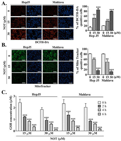 Dichlorodihydrofluorescein diacetate (DCFH-DA) is widely used in detecting reactive oxygen species (ROS) activity. In comparison to untreated HCC cells, treatment with 15 and 30 μM NOT resulted in enhanced ROS activity, as demonstrated by a 32% (p < 0.01) and 44% (p < 0.001) increase in DCFH-DA positive HepJ5 cells, or a 29% (p < 0.01) and 41% (p < 0.001) increase in Mahlavu cells, respectively (Figure 4A). Considering that the mitochondrial mass stain, MitoTracker® green (MTG), is positively correlated with ROS and reactive nitrogen species (RNS) markers [21], it was further shown that, compared to the brighter fluorescence of active mitochondria in untreated control HCC cells, NOT treatment reduced the mitochondrial fluorescence intensity and the number of MitoTracker®-positive HepJ5 (15 μM: 37%, p < 0.01; 30 μM: 76%, p < 0.001) or Mahlavu (15 μM: 33%, p < 0.01; 30 μM: 64%, p < 0.001) cells. This suggests enhanced ROS production, increased mitochondrial degeneration, and impaired biogenesis (Figure 4B). Additionally, it was demonstrated that treating HepJ5 and Mahlavu cells with 15 and 30 μM NOT for 6 h significantly reduced the antioxidant glutathione (GSH) level compared to untreated control counterparts, in a dose- and time-dependent manner (p < 0.001) (Figure 4C).