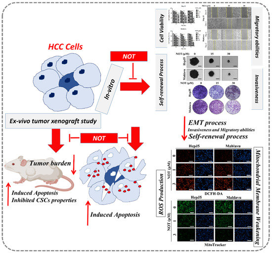 In conclusion, as shown in the schematic of Figure 6, the findings presented herein are clinically relevant for HCC management because of the prevalent tendency of HCC cells to resist contemporary chemotherapeutic agents, as exemplified by a 0.25 response rate, no significant increase in patient overall survival [33], which is invariably associated with permissive TME, and the presence of hepatocellular CSCs, as demonstrated in our study. The present study, therefore, reports an effective anti-HCC therapeutic strategy that selectively kills cancerous liver cells, based on CSCs targeting and increased oxidative stress by exogenous ROS generation therapy. In this study, it was demonstrated that NOT effectively moderates the ROS environment in HCC cells both in vitro and ex vivo, and targets key CSCs markers via the modulation of oxidative stress. However, many key factors, such as the role of miRNAs in epigenetically controlling CSCs and ROS, as well as NOT’s role in this process, have not been studied to uncover the molecular mechanism of NOT in overcoming the therapeutic challenge in HCC. Therefore, in future research, the aim will be to uncover the epigenetic role of key molecules in HCC, which may be modulated by the introduction of NOT, and to reveal the key molecular mechanisms of NOT in overcoming the therapeutic challenge.