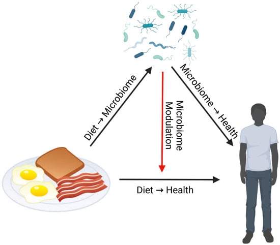 Diet–Microbiome–Health Interactions. Direct effect arrows are black, indirect effect arrow is red. Diet has direct effects on both health and the gut microbiome. The gut microbiome also has a direct effect on health as a result of changes in the community composition and/or function due to diet. However, the gut microbiome can also modulate (indirect effect) the effects of diet on health independent of diet-related changes in composition or function.