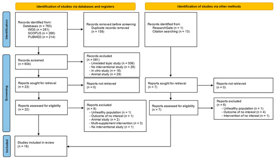 The literature search yielded 777 studies, 763 from the electronic databases WOS, SCOPUS, and PubMed, and 14 from other sources such as ResearchGate and reference lists of relevant studies. After excluding 159 duplicates, a total of 604 articles identified in databases and registers were reviewed. After title and abstract evaluation, 23 articles were considered potential registries. After reviewing the full text and assessing potential records from databases, registries, and other sources, 16 [21,22,23,24,25,26,27,28,29,30,31,32,33,34,35,36] studies were included in the systematic review (Figure 1).