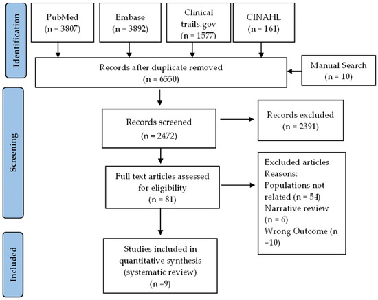 A comprehensive literature search was performed using PubMed, Embase, Clinical trails.gov, and CINAHL, as well as a manual search, which retrieved a total of 9447 studies related to vitamin D, 25-hydroxyvitamin D, vit d, asthma, and airway remodeling. After removing duplicate studies, 6650 remained; among those studies, the titles and abstracts of 2472 were screened, resulting in the exclusion of 2391 studies. The full text of the remaining 81 articles was reviewed, and 72 were excluded based on pre-specified criteria (Figure 1). The excluded studies used animal models, children, or prenatal populations (54 articles), were narrative reviews (6 articles), did not measure the effect of vitamin D on airway remodeling as an outcome of interest (10 articles), or were duplicates (2 articles). Of the remaining articles, nine articles were included for narrative systematic review.