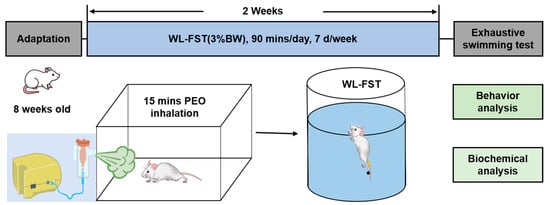 Eight-week-old Sprague-Dawley (SD) male rats weighing 230–280 g were provided by the Experimental Animal Center of Fourth Military Medical University. The rats were placed in an independently ventilated animal cage (BCR-RI01-PEI, Shandong Xinhua Medical Instrument Co., Ltd., Zibo, China) in an environment with a temperature of 22 ± 2 °C and humidity of 50–60% and fed an ad libitum standard diet. The health and behavior of rats were kept careful monitoring on a daily basis to ensure the animals were in a state of normal health and able to freely engage in activities, such as eating, drinking, and moving. After 3-day adaptive feeding and environmental acclimatization, the rats were randomly divided into a control group (saline vehicle, control), peppermint essential oil inhalation for 2 weeks (PEO), chronic fatigue induced by 2-week weight-loaded forced swimming training (WL-FST), and chronic fatigue with peppermint essential oil treatment (WL-FST+PEO), using completely randomized design (n = 8–12/group). Rats in PEO and WL-FST+PEO groups received inhalation of peppermint essential oil (mixed with saline) using a compressed air atomizer (403 M, Jiangsu Yuyue Medical Equipment Co., Ltd., Yancheng, China) for 15 min daily before exercise training, while rats in the control and WL-FST groups received inhalation of saline. Before the experiment, all rats were subjected to 20 min of swimming per day for 3 days. All the animal care and experimental procedures were approved by the Laboratory Animal Welfare and Ethics Committee of Fourth Military Medical University (Approval No.: IACUC—20201051) in compliance with the Guide for the Care and Use of Laboratory Animals published by the US National Institutes of Health. The experiment protocol is illustrated in Figure 1.