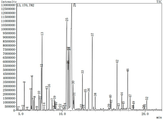 Menthol, menthol ketone, menthol acetate, and menthol furan are the main components that constitute the characteristic aroma of peppermint essential oil, giving the essential oil a cool and high-quality mint aroma [6]. We used GC-MS to analyze and identify the volatile chemical components of the essential oil. The obtained chromatogram of peppermint essential oil showed 52 chemical components, accounting for 99.34% of the essential oil, as illustrated in Figure 2 and Table 1. Among them, there are 12 main components with a content of more than 1% in peppermint essential oil, which are menthol (37.01%), menthone (21.83%), 1,8-cineole (6.36%), L-menthol acetate (5.34%), (+)-menthone (4.71%), D-menthol (3.41%), β-Caryophyllene (2.66%), menthofuran (2.43%), menthone (1.94%), (R)-(+)-limonene (1.89%), β-Cyclopentene (1.62%), and β-Pinene (1.41%), accounting for 90.61% of the total composition of the essential oil.