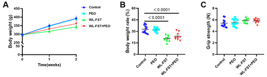After 2-week forced swimming, the body weight of rats dropped to 342.6 ± 7.8 g (WL-FST) and 362.0 ± 14.7 g (WL-FST+PEO) compared with the control (390.3 ± 12.2 g), with a significant difference in the rate of body weight change (Figure 3A,B). Grip strength measurement showed that there was no significant difference among the groups, 5.40 ± 0.19 N in the control, 5.52 ± 0.17 N in PEO, 5.80 ± 0.18 N in WL-FST, and 5.77 ± 0.13 N in WL-FST+PEO (Figure 3C). The results indicated that inhaling peppermint essential oil had no effect on muscular strength in endurance-trained rats.