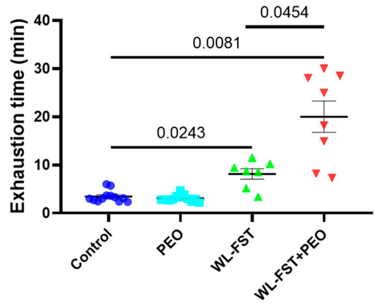 As a measure for defining exercise performance, the mean swimming time until exhaustion was recorded in an exhaustive swimming test following 2-week endurance training. The mean swimming time until exhaustion in the WL-FST+PEO group was 18.55 ± 4.33 min, significantly prolonged compared with 8.06 ± 1.28 min in the WL-FST group (Figure 4). In addition, rats in WL-FST performed better than the control rats, indicating the effects of exercise training. However, unexercised rats who received essential oil inhalation for 2 weeks did not perform as well as the rats in WL-FST (Figure 4). The results suggest that inhalation of essential oil and exercise training synergistically improves exercise performance.
