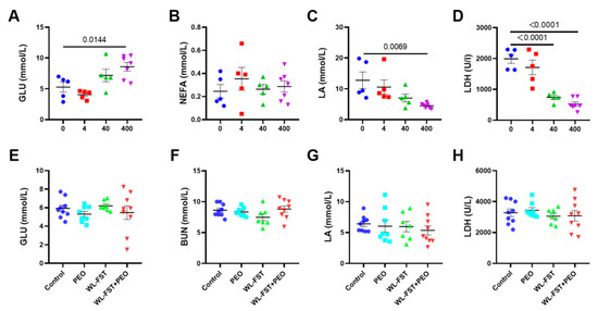 In the chronic exercise-induced fatigue experiment, we chose peppermint essential oil at a dosage of 16 μL/h and did not observe a significant difference (p > 0.05) in the serum levels of GLU, BUN, LA, and LDH (Figure 5E–H) among different rat groups.
