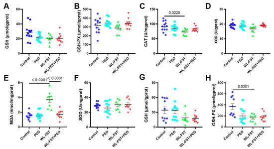 GSH Px content in skeletal muscle tissue of rats in the WL-FST group was lower than that in the control group (166.26 ± 24.27 vs. 370.76 ± 54.93, p < 0.05), but there was no significant difference between WL-FST+PEO group and WL-FST group (p > 0.05) (Figure 6H). The contents of SOD and GSH in the skeletal muscle of animals in each group had no significant difference (p > 0.05) (Figure 6F,G). In addition, there was no significant difference in the contents of GSH, GSH Px, CAT, and XOD in the liver tissues (p > 0.05) (Figure 6A–D), suggesting no significant changes in redox status.