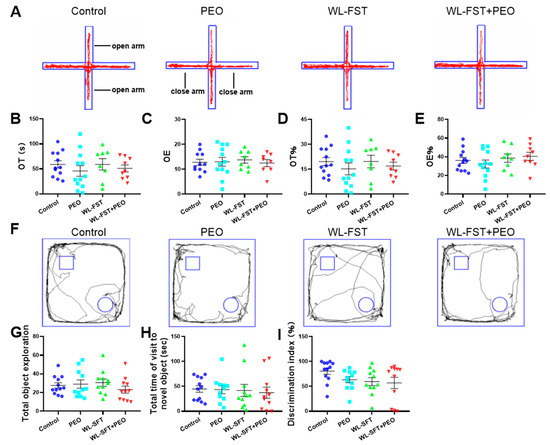 In the NOR experiment, the average total exploration times of the control, PEO, WL-FST, and WL-FST+PEO groups of rats were 30.17 ± 2.98, 30.17 ± 4.50, 30.33 ± 4.11, and 29.50 ± 5.17 times, respectively. The average exploration times of the new object were 44.83 ± 6.72 s, 40.12 ± 7.94 s, 39.31 ± 11.44 s, and 34.27 ± 10.63 s, respectively. The average novel object DI values were 80.52 ± 6.53%, 64.46 ± 5.62%, 61.42 ± 7.46%, and 52.14 ± 11.48%, respectively (Figure 7F–I).