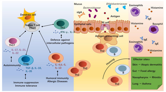 The onset of allergic diseases is associated with the differentiation of T lymphocytes (T cells, Figure 1). Under the co-stimulation with the surrounding environment, dendritic cells (DC) induce the native T cells (Th0) into distinct T helper subsets mainly including Th1, Th2, Th17, and Treg cells [7]. Of these, Th2 cells, which secrete Interleukin (IL)-4, IL-5, and IL-13, are the main mediators of humoral immunity and the key cells in triggering an allergy [8]. Due to insufficient stimulation by external pathogens during infancy, the balance tilts towards Th2 cells, leading to the development of an allergy. With increasing age and exposure to external pathogens, some infants are able to self-heal their allergic symptoms and achieve a normalized immune function [9,10,11]. Th1 cells are mainly involved in cellular immunity and participate in the defense against intercellular pathogens by producing INF-γ and IL-2 [12], working in antagonism with Th2 cells [13]. Th17 cells can act on neutrophils and induce autoimmunity in vivo [14] and are observed to be increased in the body of allergic patients with disturbed immune homeostasis through the secretion of IL-17, IL-21, and IL-22 [15,16]. While Treg cells are regulated by the intestinal environment and microbiota, they are expressed in the lymphoid tissues of the intestine to down-regulate the expression of Th2 cells and establish food-protein-related immune tolerance by producing anti-inflammatory cytokines, such as IL-10 and TGF-β [17].