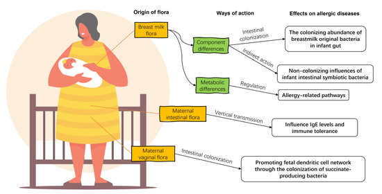 The impacts of maternal flora on infant allergic diseases. Maternal breast milk flora enters directly into the gut of the allergic infant, regulating the composition of the infant intestinal flora and the diversity of associated strains directly and indirectly. There are differences in the ability of the breast milk flora of allergic infants to metabolize their hosts compared to healthy ones. The maternal gut flora influence offspring IgE levels and immune tolerance by vertical transmissions. Maternal vaginal bacteria regulate the development of the offspring’s dendritic cell network by colonization.