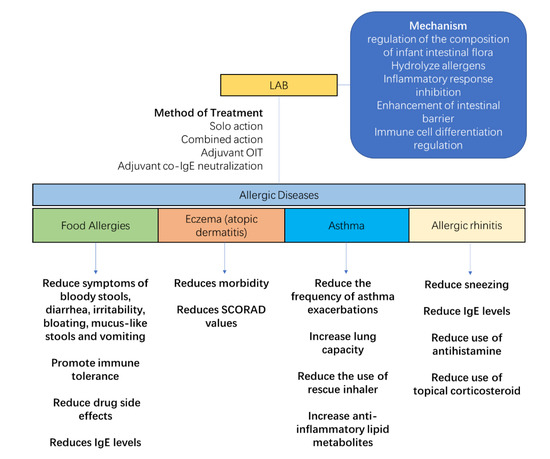 Lactic acid bacteria (LAB) relieve the symptoms of allergic diseases. Their anti-allergic effect is achieved through five areas: regulation of the intestinal flora of allergic infants, hydrolysis of allergens, inhibition of the inflammatory response, enhancement of the intestinal barrier, and modulation of immune cell differentiation. Therapeutic modalities include solo action, combined action, and adjuvant therapy. For allergic diseases, LAB reduce digestive disorders caused by food allergy, increase immune tolerance, reduce the side effects of drug administration, reduce the morbidity and symptoms of eczema, increase lung function and immune tolerance in asthmatics, and reduce symptoms and the use of medication of rhinitis.