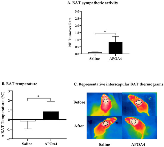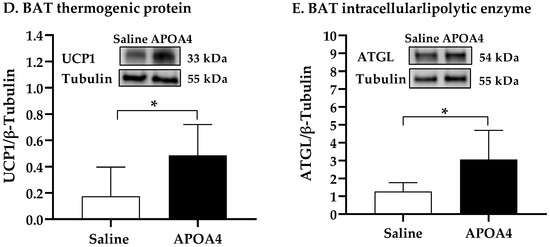 Further, we investigated if the continuous infusion of APOA4 at 1.2 mg/kg a day for 4 weeks would elevate BAT thermogenesis in lean mice housed at 28 °C. In mice, continuous infusion of APOA4 for 4 weeks significantly raised plasma APOA4 levels, making them 40% higher than those in saline-treated mice (p < 0.05, Figure 1A). In contrast, plasma APOA1 protein levels were similar between APOA4- and saline-treated mice (Figure 1B). Because acute administration of APOA4 stimulates sympathetic activity assessed by the NE turnover rate and thermogenesis in the BAT of chow-fed mice [20], sympathetic activity and UCP1-dependent thermogenesis in the BAT of mice with a continuous infusion of either APOA4 or saline were measured. In the current experiments, APOA4 infusion significantly elevated sympathetic activity and increased BAT temperature relative to saline treatment (p < 0.05, Figure 2A–C). APOA4 infusion also increased levels of UCP1 protein and ATGL protein, an intracellularlipolytic enzyme [5], in BAT compared to saline treatment (p < 0.05, Figure 2D,E).