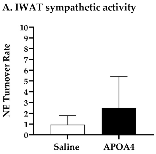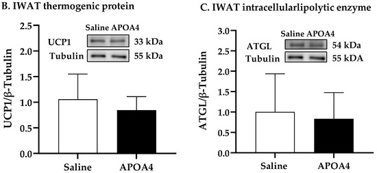 Sympathetic neural activation elevates UCP1-positive cells in subcutaneous IWAT that contains brown adipocytes for the induction of thermogenesis [36]. To examine if the continuous infusion of APOA4 would elevate UCP1-dependent thermogenesis in IWAT, sympathetic activity and thermogenesis in subcutaneous IWAT were assessed. APOA4 infusion did not change sympathetic activity in subcutaneous IWAT relative to saline treatment (Figure 3A). Additionally, the levels of UCP1 and ATGL in the subcutaneous IWAT of APOA4-treated mice were comparable to those in saline-treated mice (Figure 3B,C). The findings suggest that continuous infusion of APOA4 increases plasma APOA4 levels and sympathetic activity, and elevates ATGL intracellular lipolytic enzyme and UCP1-dependent thermogenesis in BAT while APOA4 infusion does not alter sympathetic activity, ATGL intralipolytic enzyme levels, or UCP1-dependent thermogenesis in subcutaneous IWAT.