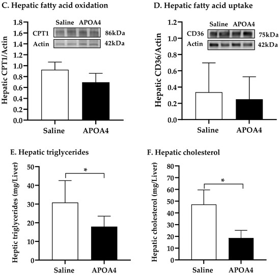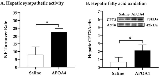Carnitine palmitoyltransferase (CPT) serves as a key regulatory enzyme of hepatic fatty acid oxidation in the mitochondria [38,39]. CD36 is a key scavenger receptor that promotes the transfer of long-chain fatty acid into liver cells [40]. To investigate whether or not APOA4 infusion stimulated hepatic sympathetic activity and regulated fatty acid oxidation and uptake in the liver, the NE turnover rate, and CPT1, CPT2 and CD36 levels in the liver were measured. Hepatic sympathetic activity and CPT2 levels in APOA4-treated mice were greater than those in saline-treated mice (p < 0.05, Figure 5A,B). In contrast, CPT1 levels in the liver were comparable between the APOA4 and saline treatment (Figure 5C). APOA4 infusion did not alter CD36 in the liver compared to that in the liver of saline-treated mice (Figure 5D), suggesting that APOA4 infusion did not change CD36-mediated lipid uptake by the liver. APOA4-treated mice had less TG and cholesterol in the liver than saline-treated mice had although they had comparable liver weights (p < 0.05, Figure 5E,F and Table 1). The findings suggest that APOA4 infusion may elevate hepatic sympathetic activity and attenuate hepatic lipids through the elevation of fatty acid oxidation but does not alter CD36-mediated fatty acid uptake by the liver.