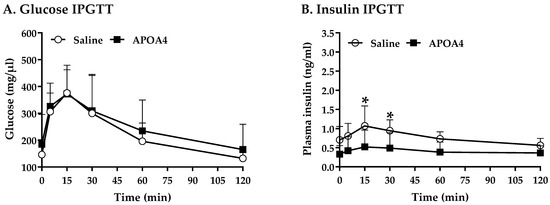 Five-hour-fasted mice with APOA4 or saline infusion (n = 9 or 10 mice per group) received intraperitoneal injections of 2 mg of glucose/g body weight (Sigma, St. Louis, MO, USA) in saline according to our published protocol [33]. Tail blood glucose and plasma insulin were measured before glucose administration and at 15, 30, 60 and 120 min post-injection of the glucose solution. Whole blood glucose was determined using a Bayer Contour glucometer and glucose strips (Ascensia Diabetes Care US Inc., Parsippany, NJ, USA), and plasma insulin was determined using an enzyme-linked immunosorbent assay (ELISA; see details in Section 2.8).