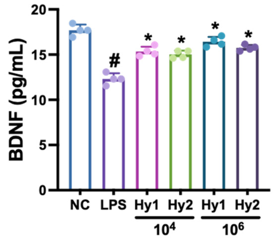 Effects of L. casei HY2782 and B. lactis HY8002 on LPS-suppressed BDNF expression in SH-SY5Y cells. Probiotics (Hy1, HY2782; Hy2, HY8002) were administered at a dose of 1 × 104 or 1 × 106 CFU/mL. LPS and NC mice were treated with LPS (100 ng/mL) or saline, respectively. Dn = 4. # p < 0.05 vs. NC. * p < 0.05 vs. LPS.