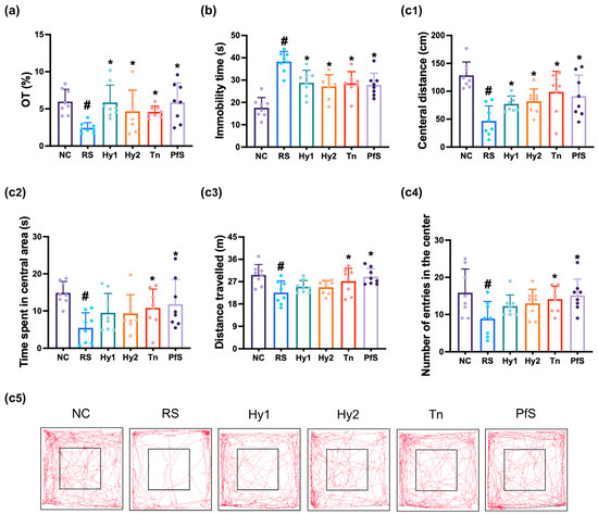 Effects of L. casei HY2782, B. lactis HY8002, L-theanine, and their supplement on RS-induced DA-like behaviors in mice. Behaviors were assessed in the EPMT (a), TST (b), and OPT (c: (c1), CD; (c2), CT; (c3), TN; (c4), CN; (c5), track path). Test agents (RS, saline; Hy1, HY2782; Hy2, HY8002; Tn, L-theanine; PfS, probiotics-fermented L-theanine-containing supplement) were orally gavaged. NC mice were treated with vehicle. n = 8. # p < 0.05 vs. NC. * p < 0.05 vs. RS.