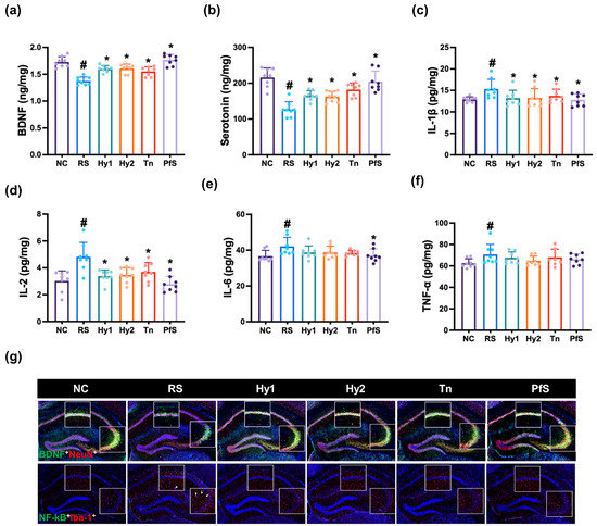 Effects of L. casei HY2782, B. lactis HY8002, L-theanine, and their supplement on RS-induced neuroinflammation in mice. Effects on hippocampal BDNF (a), serotonin (b), IL-1β (c), IL-2 (d), IL-6 (e), and TNF-α levels (f), and NF-κB+Iba1+ and BDNF+NeuN+ cell numbers (g). Test agents (RS, saline; Hy1, HY2782; Hy2, HY8002; Tn, L-theanine; PfS, probiotics-fermented L-theanine-containing supplement) were orally gavaged. NC mice were treated with vehicle. n = 8. # p < 0.05 vs. NC. * p < 0.05 vs. RS.